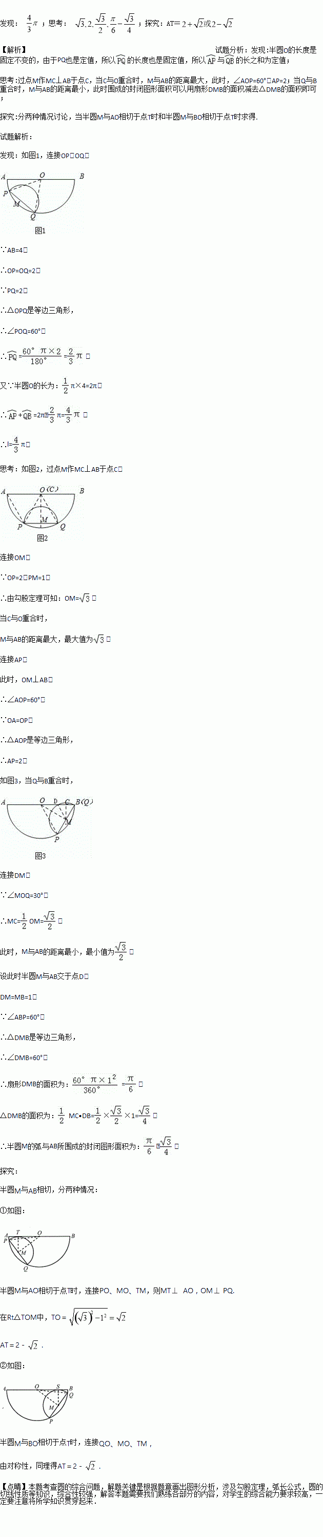 思考.点M与AB的最大距离为_______,此时点P,A间的距离为_______;点M与AB的最小距离为________,此时半圆M的弧与AB所围成的封闭图形面积为________.