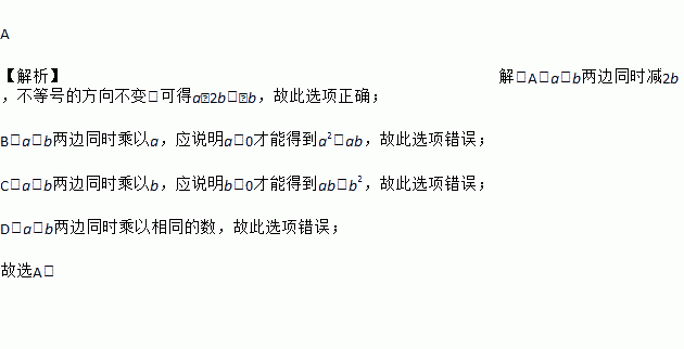 A. a﹣2b<﹣b B. a2<ab C. ab<b2 D. a2<b2
