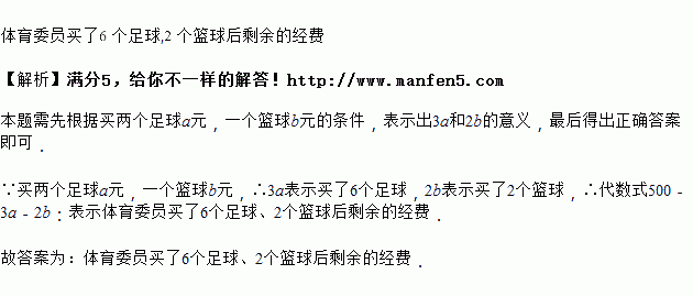 体育委员带了元钱去买体育用品,若2个足球元,1个篮球元,则代数式表示________.