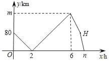 甲、乙两车从A地出发,匀速驶向B地.甲车以80km/h的速度行驶1h后,乙车才沿相同路线行驶.乙车先到达B地并停留1h后,再以原速按原路返回,直至与甲车相遇.在此过程中,两车之间的距离y(km)与乙车行驶时间x(h)之间的函数关系如图所示.下列说法:①乙车的速度是120km/h;②m=160;③点H的坐标是(7,80);④n=7.5.其中说法正确的有( )