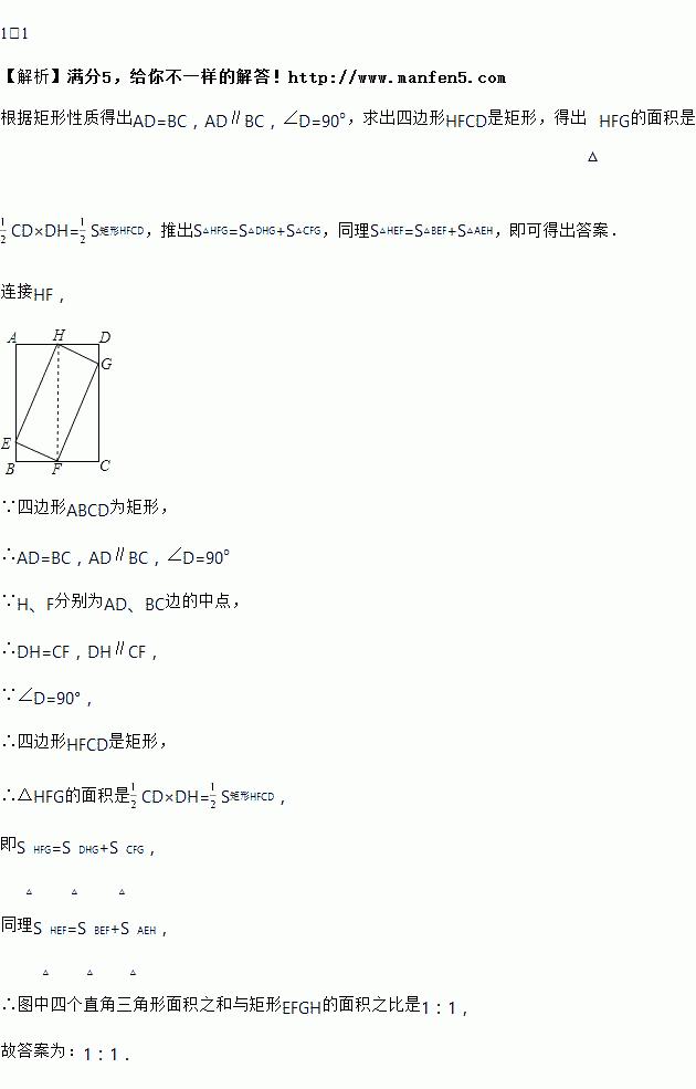如图,四边形ABCD为矩形,H、F分别为AD、BC边的中点,四边形EFGH为矩形,E、G分别在AB、CD边上,则图中四个直角三角形面积之和与矩形EFGH的面积之比为_____.