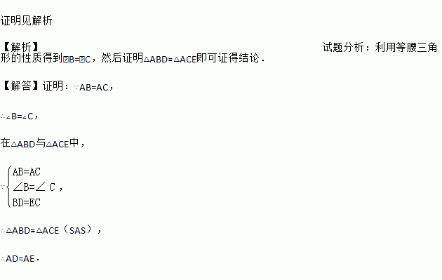 如图,点D,E在△ABC的边BC上,AB=AC,BD=CE.