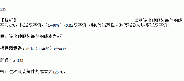 一家商店将某种服装按成本价提高40%标价,又以8折优惠卖出,结果每件仍获利15元,这种服装每件的成本多少元?
