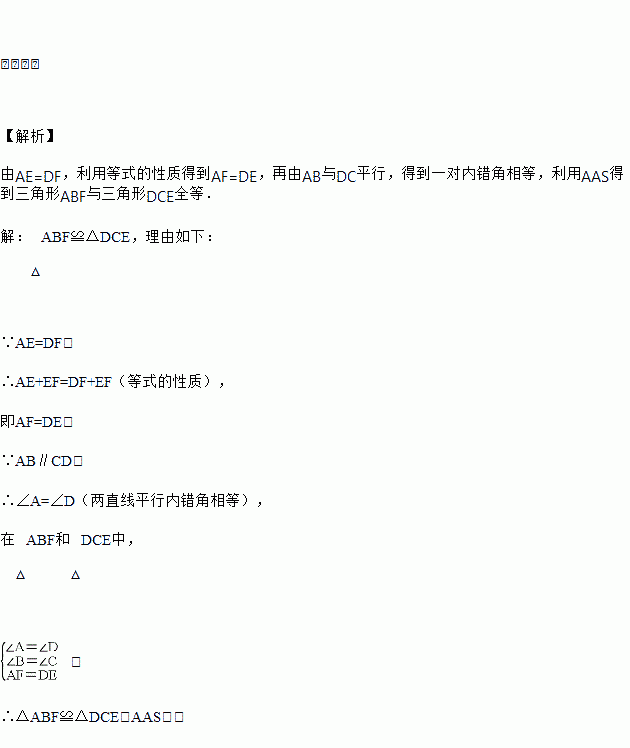 如图,点A、E、F、D在同一条直线上,AE=DF,∠B=∠C,AB∥CD,则△ABF≌△DCE吗?请说明你的理由.