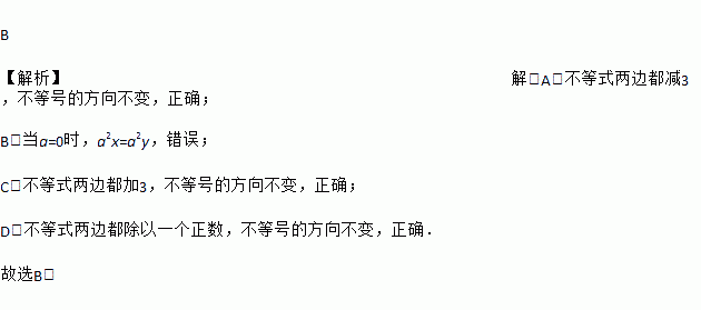 A. x﹣3>y﹣3 B. ﹣3x>﹣3y C. x+3>y+3 D. >