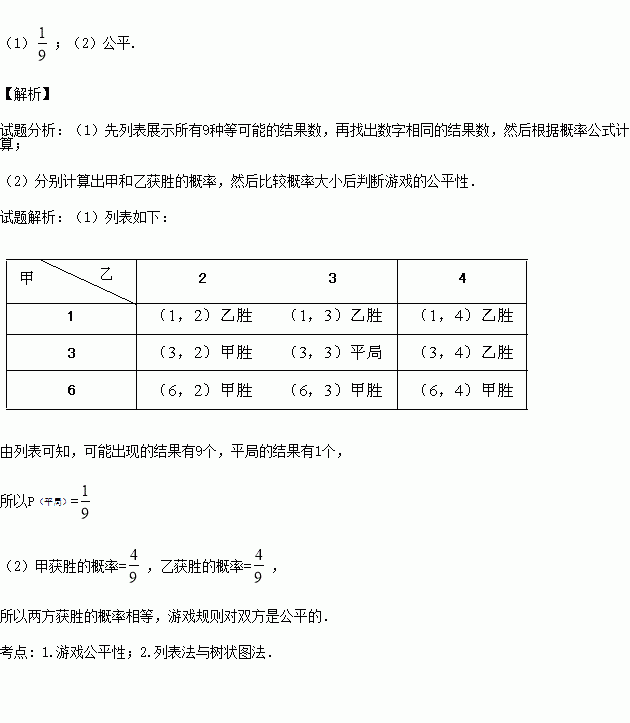 甲、乙两名同学玩抽纸牌比大小的游戏,规则是:“甲将同一副牌中正面分别标有数字1,3,6的三张牌洗匀后,背面朝上放置在桌面上,随机抽一次且一次只抽一张,记下数字;乙将同一副牌中正面分别标有数字2,3,4的三张牌洗匀后,背面朝上放置在桌面上,随机抽一次且一次只抽一张,记下数字;若甲同学抽得的数字比乙同学抽得的数字大,甲获胜,反之乙获胜,若数字相同,视为平局.”