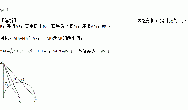 如图,在Rt△ABC中,∠ACB=90°,ACBC=2,以BC为直径的半圆交AB于点D,P是弧CD上的一个动点,连结AP,则AP的最小值是_________.