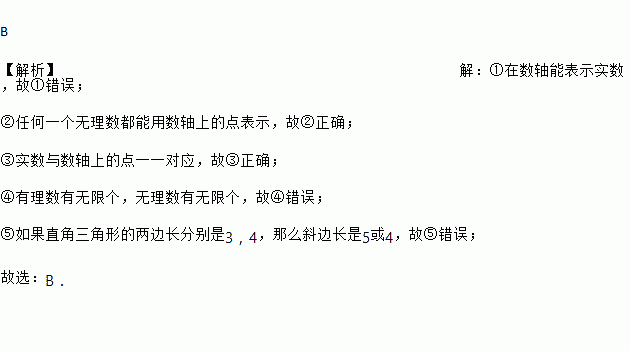 B 【解析】【解析】 ①在数轴能表示实数,故①错误; ②任何一个无理数都能用数轴上的点表示,故②正确; ③实数与数轴上的点一一对应,故③正确; ④有理数有无限个,无理数有无限个,故④错误; ⑤如果直角三角形的两边长分别是3,4,那么斜边长是5或4,故⑤错误; 故选:B.