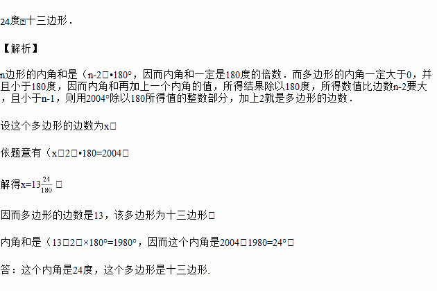 小明在求一个多边形的内角和时,由于疏忽,把一个内角加了两遍,而求出的结果为2004°,请问这个内角是多少度?这个多边形是几边形?