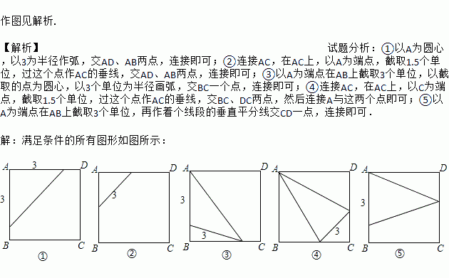如图,在边长为4的正方形ABCD中,请画出以A为一个顶点,另外两个顶点在正方形ABCD的边上,且含边长为3的所有大小不同的等腰三角形.(要求:只要画出示意图,并在所画等腰三角形长为3的边上标注数字3)