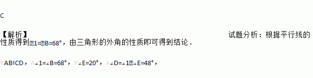 C 【解析】试题分析:根据平行线的性质得到∠1=∠B=68°,由三角形的外角的性质即可得到结论. ∵AB∥CD,∴∠1=∠B=68°,∵∠E=20°,∴∠D=∠1﹣∠E=48°,