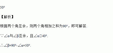 已知∠α与∠β互余,且∠α=40°,则∠β为_____.