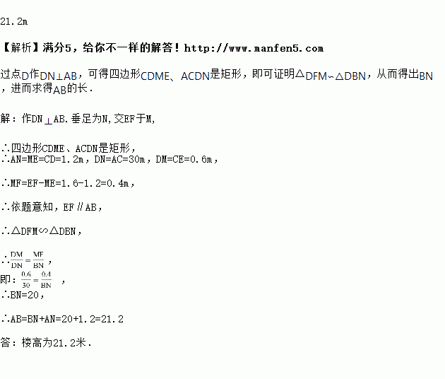 李航想利用太阳光测量楼高.他带着皮尺来到一栋楼下,发现对面墙上有这栋楼的影子,针对这种情况,他设计了一种测量方案,具体测量情况如下:如示意图,李航边移动边观察,发现站到点E处时,可以使自己落在墙上的影子与这栋楼落在墙上的影子重叠,且高度恰好相同.此时,测得李航落在墙上的影子高度CD=1.2m,CE=0.6m,CA=30m(点A、E、C在同一直线上).已知李航的身高EF是1.6m,请你帮李航求出楼高AB.