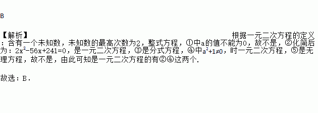 B 【解析】根据一元二次方程的定义:含有一个未知数,未知数的最高次数为2,整式方程,①中a的值不能为0,故不是,②化简后为:2x2-56x+241=0,是一元二次方程,③是分式方程,④中a2+1≠0,时一元二次方程,⑤是无理方程,故不是,由此可知是一元二次方程的有②④这两个. 故选:B.