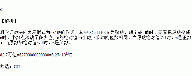 2018年政府工作报告指出,过去五年来,我国经济实力跃上新台阶.国内生产总值从54万亿元增加到82.7万亿元,稳居世界第二,82.7万亿用科学记数法表示为( )