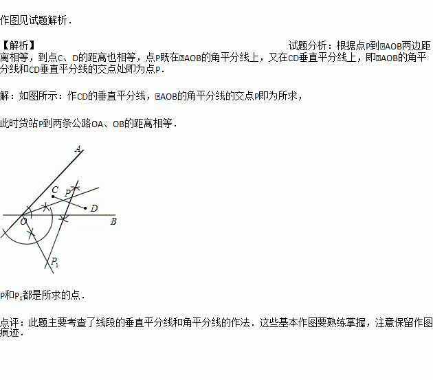 如图,两条公路OA和OB相交于O点,在∠AOB的内部有工厂C和D,现要修建一个货站P,使货站P到两条公路OA、OB的距离相等,且到两工厂C、D的距离相等,用尺规作出货站P的位置.(要求:不写作法,保留作图痕迹,写出结论)