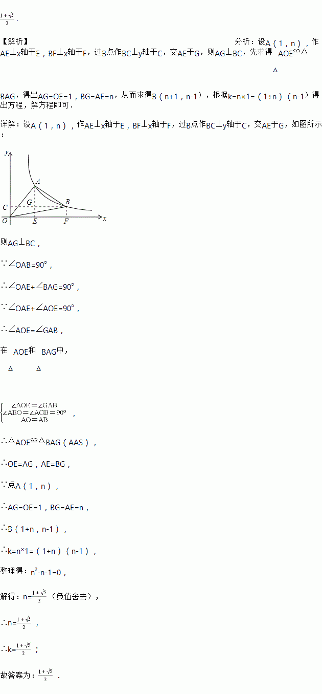 如图,双曲线y= (x>0)经过A、B两点,若点A的横坐标为1,∠OAB=90°,且OA=AB,则k的值为________.