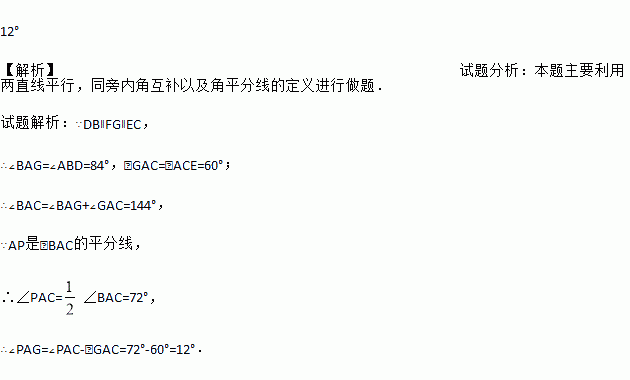 如图,已知DB∥FG∥EC,∠ABD=84°,∠ACE=60°,AP是∠BAC的平分线.求∠PAG的度数.