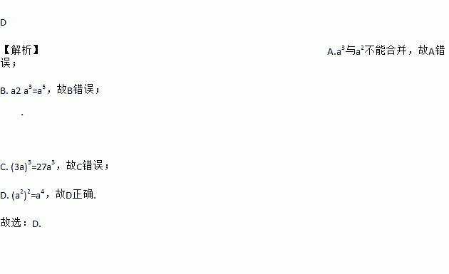 D 【解析】A.a3与a2不能合并,故A错误; B.a2?a3=a5,故B错误; C.(3a)3=27a3,故C错误; D.(a2)2=a4,故D正确. 故选:D.