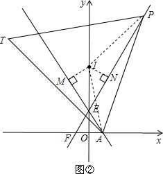 (3)如图②,F是点A关于y轴的对称点,作直线FE.P是直线FE上的E点上方一动点,连接PA,在PA的左侧作等边△PAT,I是∠APT与∠PAT的角平分线的交点.当点P运动时,点I是否总在y轴上运动?请判断并证明你的结论.