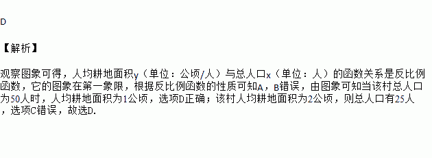 某村耕地总面积为50公顷,且该村人均耕地面积y(单位:公顷/人)与总人口x(单位:人)的函数图象如图所示,则下列说法正确的是( )