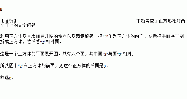 水平放置的正方体的六个面分别用“前面,后面,上面,下面,左面,右面”表示,如图是一个正方体的平面展开图,若图中“2”在正方体的前面,则这个正方体的后面是( )