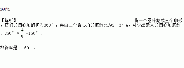 160°. 【解析】将一个圆分割成三个扇形,它们的圆心角的和为360°,再由三个圆心角的度数比为2:3:4,可求出最大的圆心角度数:360°×=160°. 故答案是:160°.