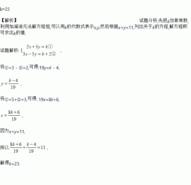 已知x,y是方程组的解,且x,y的和为11,求k的值.