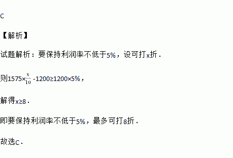 某种商品的进价为1200元,标价为1575元,后来由于该商品积压,商店准备打折出售,但要保持利润不低于5%,则至多可打( )