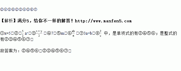 下列式子①,②,③,④,⑤,⑥,⑦,⑧ 中,是单项式的有________;是整式的有________.(只填序号)