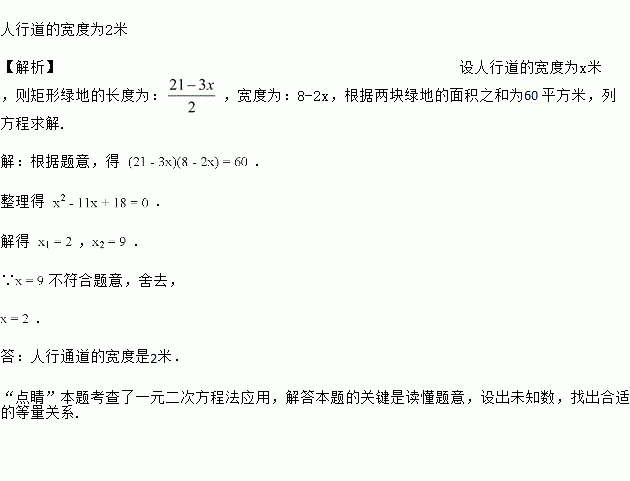 某小区有一块长21米,宽8米的矩形空地,如图所示.社区计划在其中修建两块完全相同的矩形绿地,并且两块绿地之间及四周都留有宽度为x米的人行通道.如果这两块绿地的面积之和为60平方米,人行通道的宽度应是多少米?