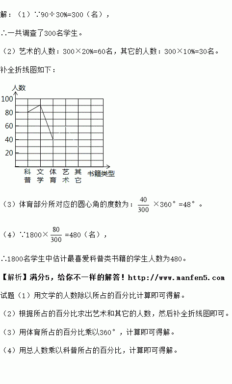 (4)如果这所中学共有学生1800名,那么请你估计最喜爱科普类书籍的学生人数.