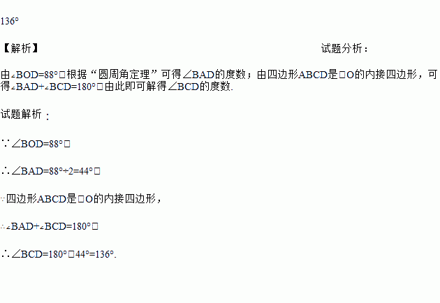 如图,四边形ABCD是⊙O的内接四边形,若∠BOD=88°,求∠BCD的度数.