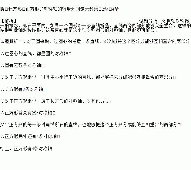 圆、长方形、正方形都是轴对称图形,说出他们分别有几条对称轴.