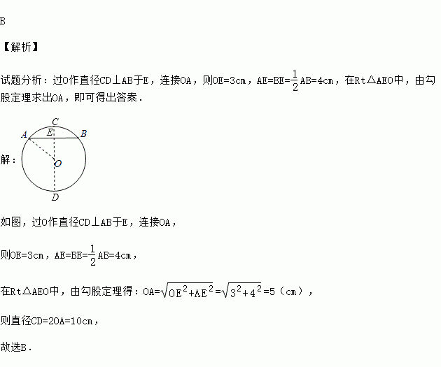 如图,在⊙O中,弦AB的长为8cm,圆心O到AB的距离为3cm,则⊙O的直径为( )
