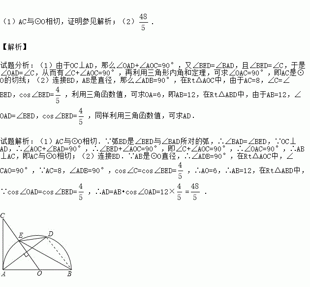 如图,AB是半圆O的直径,过点O作弦AD的垂线交半圆O于点E,交AC于点C,使∠BED=∠C.