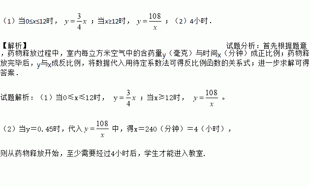(2)据测定,当空气中每立方米的含药量降低到0.45毫克以下时,学生方可进入教室,那么从药物释放开始,至少需要经过多少小时后,学生才能进入教室?
