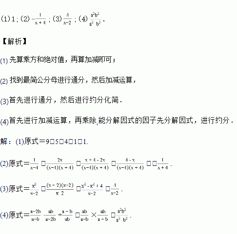 (1)计算:(-3)2--|-4|+(-2)0; (2)化简:;