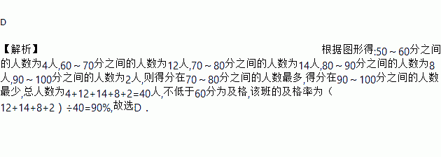 D 【解析】根据图形得:50~60分之间的人数为4人,60~70分之间的人数为12人,70~80分之间的人数为14人,80~90分之间的人数为8人,90~100分之间的人数为2人,则得分在70~80分之间的人数最多,得分在90~100分之间的人数最少,总人数为4+12+14+8+2=40人,不低于60分为及格,该班的及格率为(12+14+8+2)÷40=90%,故选D.