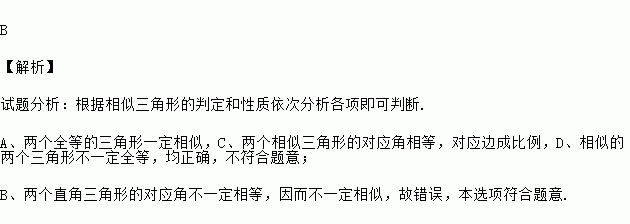 B 【解析】 试题分析:根据相似三角形的判定和性质依次分析各项即可判断. A、两个全等的三角形一定相似,C、两个相似三角形的对应角相等,对应边成比例,D、相似的两个三角形不一定全等,均正确,不符合题意; B、两个直角三角形的对应角不一定相等,因而不一定相似,故错误,本选项符合题意.