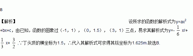 平时我们在跳绳时,绳摇到最高点处的形状可近似地看做抛物线,如图所示.正在摇绳的甲、乙两名同学拿绳的手间距为4 m,距地高均为1 m,学生丙、丁分别站在距甲拿绳的手水平距离1 m,2.5 m处.绳子在摇到最高处时刚好通过他们的头顶.已知学生丙的身高是1.5 m,则学生丁的身高为 ( )