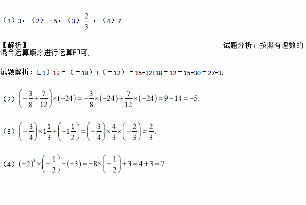 计算:(1)12﹣(﹣18)+(﹣12)﹣15;(2)(﹣+)×(﹣24)