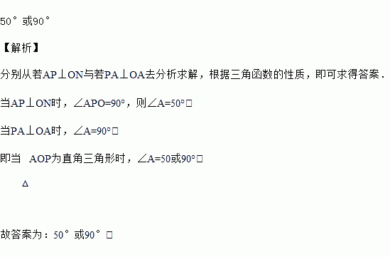 如图,已知∠AON=40°,OA=6,点P是射线ON上一动点,当△AOP为直角三角形时,∠A=_____°.