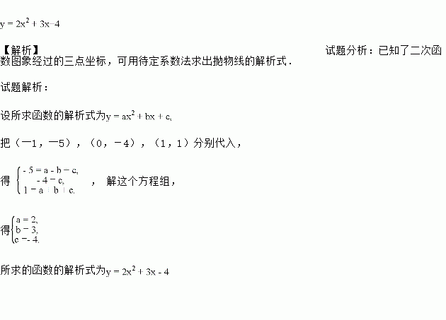 【解析】试题分析:已知了二次函数图象经过的三点坐标,可用待定系数法求出抛物线的解析式. 试题解析: 设所求函数的解析式为 把(―1,―5),(0,-4),(1,1)分别代入, 得 , 解这个方程组, 得 所求的函数的解析式为