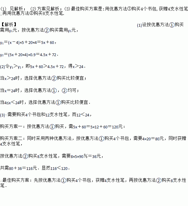 (1) 见解析; (2)方案见解析;(3)最佳购买方案是:用优惠方法①购买4个书包,获赠4支水性笔;再用优惠方法②购买8支水性笔. 【解析】(1)设按优惠方法①购买需用y1元,按优惠方法②购买需用y2元, y1=(x-4)×5+20×4=5x+60, y2=(5x+20×4)×0.9=4.5x+72. (2)令y1>y2,即5x+60>4.5x+72,得x>24. 当...