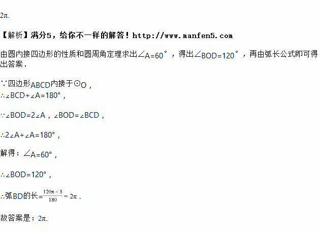 如图,⊙O的半径为3,四边形ABCD内接于⊙O,连接OB,OD,若∠BOD=∠BCD,则的长为____.