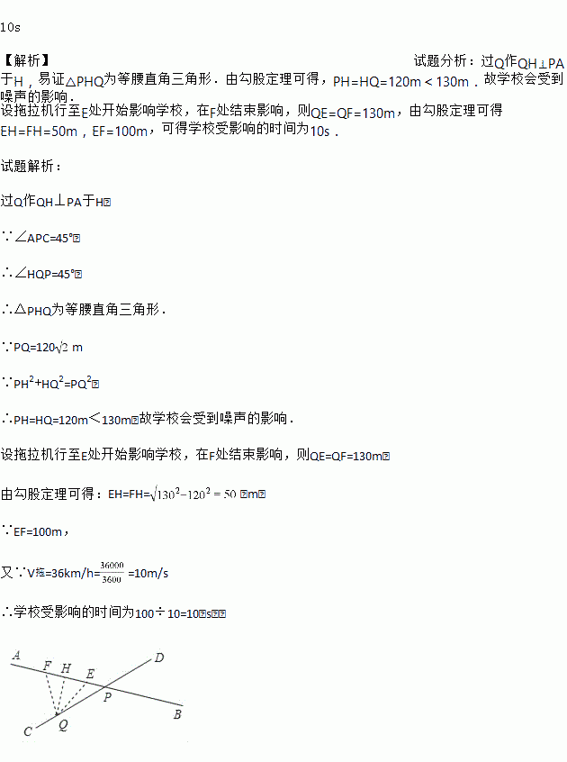 ,假设拖拉机行驶时,周围130m以内会受到噪声的影响,那么拖拉机在公路AB上沿PA方向行驶时,学校是否会受到噪声影响?请说明理由;若受影响,已知拖拉机的速度为36km/h,那么学校受影响的时间为多少秒?