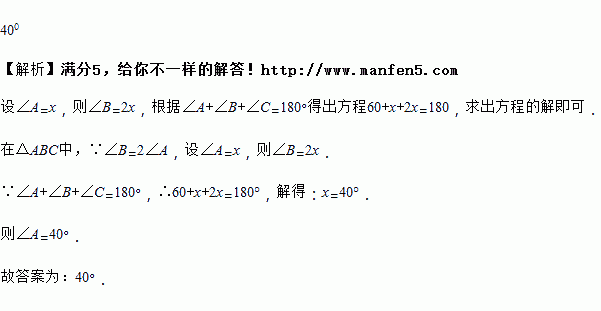 在△ABC中,若∠B=2∠A,∠C=60°,则∠A=_________.