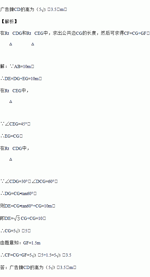 在一次课外活动中,甲、乙两位同学测量公园中孔子塑像的高度,他们分别在A,B两处用高度为1.5m的测角仪测得塑像顶部C的仰角分别为30°,45°,两人间的水平距离AB为10m,求塑像的高度CF.(结果保留根号)