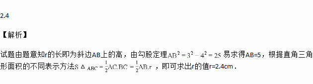 Rt△ABC中,∠C=90°,AC=3cm,BC=4cm,以C为圆心,r为半径作圆,若圆C与直线AB相切,则r的值为_______cm.